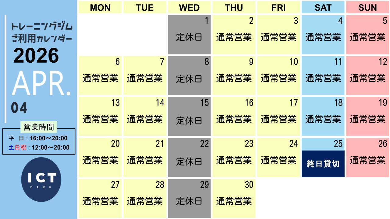 【トレーニングジム】4月の営業予定